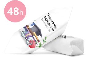 Na tym jednak nie koniec. Jak wiadomo liczy się wnętrze. A to dzięki odpowiedniej proporcji składników takich, jak cukier i mleko, jest doskonałe. To nieziemsko pyszna słodycz, która rozpływa się w ustach. Taki smaczny upominek z logo z całą pewnością przypadnie do gustu Twoim bliskim, znajomym oraz klientom.
